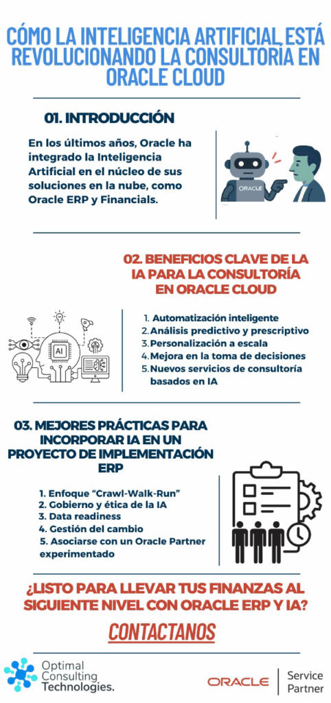 La IA ya no es un complemento: es la columna vertebral de la transformación digital en Oracle Cloud. Quienes integren hoy IA en Oracle ERP obtendrán automatización, analítica predictiva y personalización a escala, respaldadas por la robustez de Oracle Fusion. Con Optimal Consulting a su lado, su organización capitalizará estas ventajas más rápido y con menor riesgo.